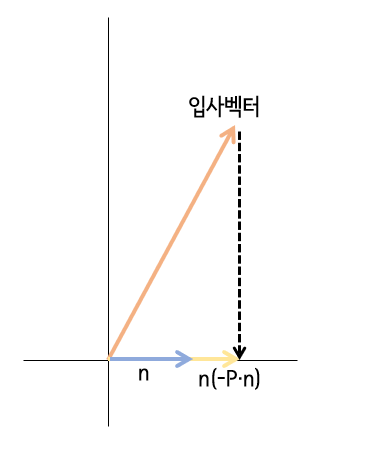 그 후 입사 벡터 P의 시작 위치를 원점에 위치 시키고 투영으로 구한 n(-P·n)를 더하면 입사면에 투영된 벡터의 위치를 구할 수 있다.