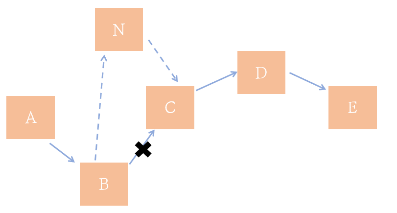 이렇게 B와 C를 연결해 주던 것을 없애고 B를 N과 N과 C를 연결한다. 그러면 A->B->N->C->D->E 순으로 연결되며 B와 C사이에 N이 위치하게 된다.