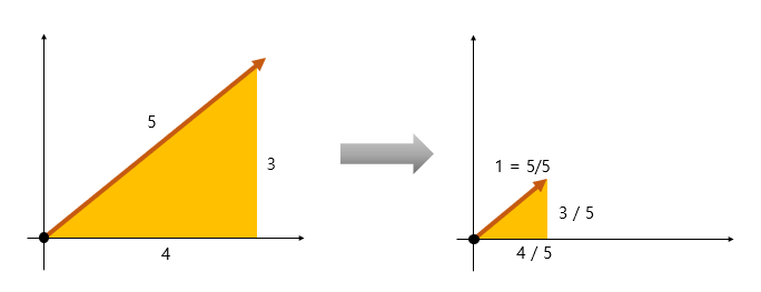 벡터의 각 성분을 벡터의 크기로 나누면 벡터가 정규화 된다.